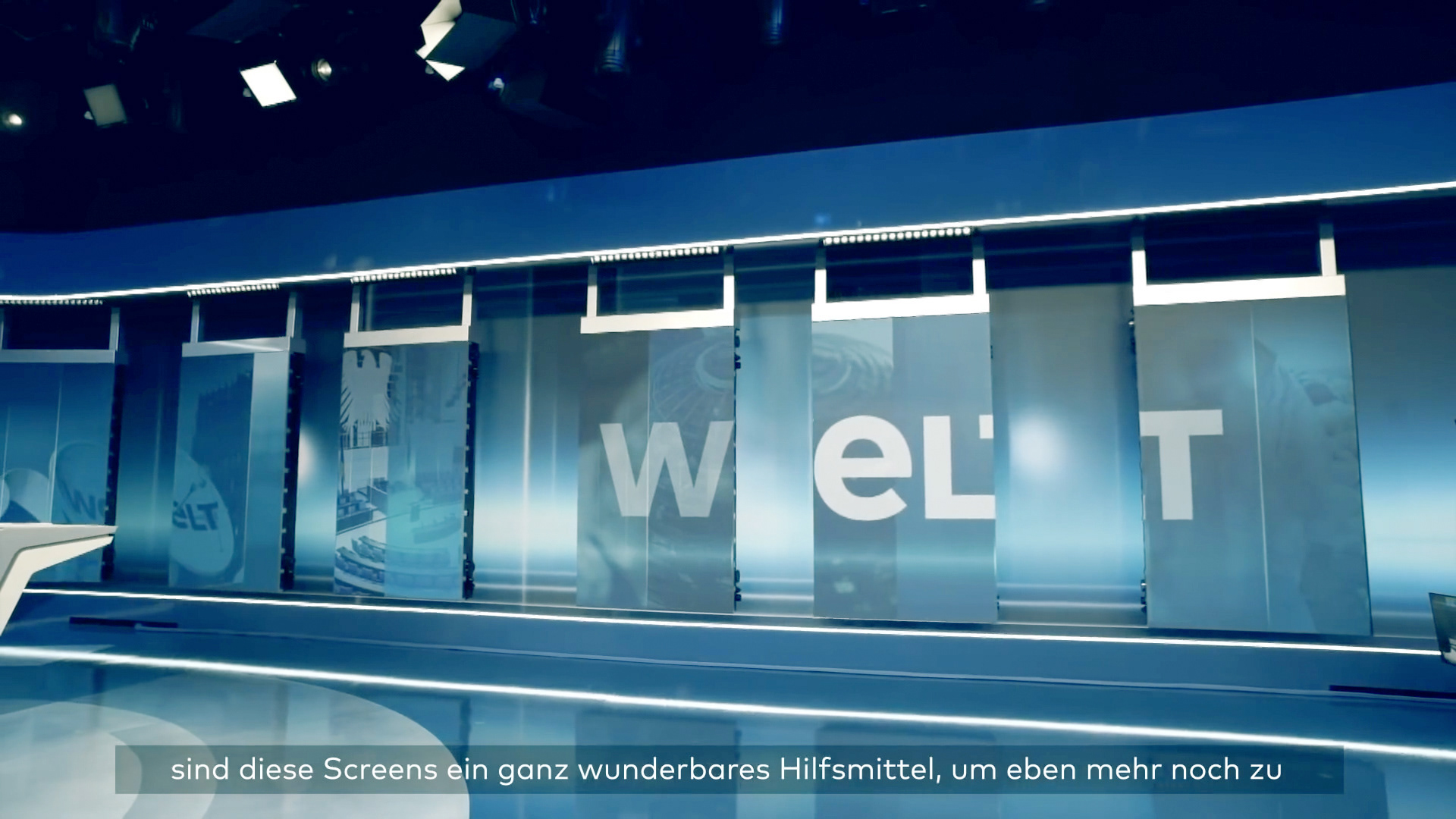 For the new hightech Welt newsroom, with flexable moving LED screens and the fully wrapped around background screen named Cyclorama, we designed and produced the huge background loops.